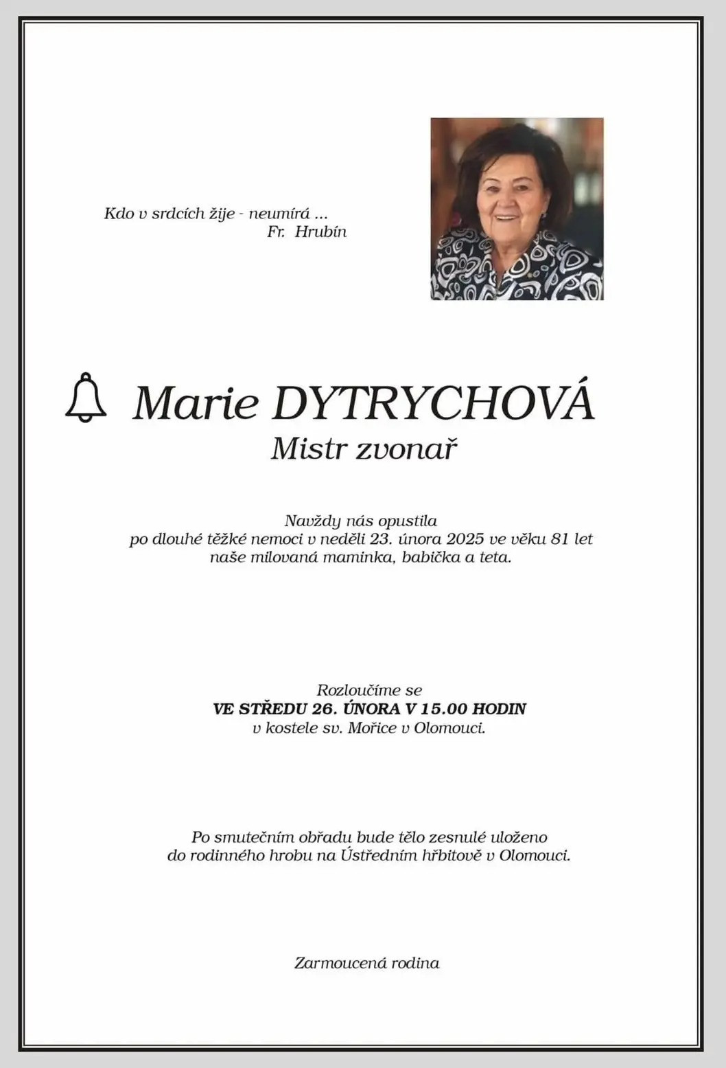 Marie Tomášková-Dytrychová zemřela po těžké nemoci. S ženou, která dokázala desítky let vést jedinečnou zvonařskou dílnu a velmi se zasloužila o její další proslulost a mezinárodní odborné renomé, se blízcí rozloučí ve středu 26. února v 15 hodin v olomouckém chrámu svatého Mořice. Právě tento kostel má v hlavní věži čtyři zvony, které byly v 80. letech odlity rovněž v dílně Dytrychových.