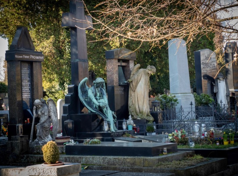 ÚTOK NA HŘBITOV Otevřené hroby a urny, poničené náhrobky a policie na hřbitově