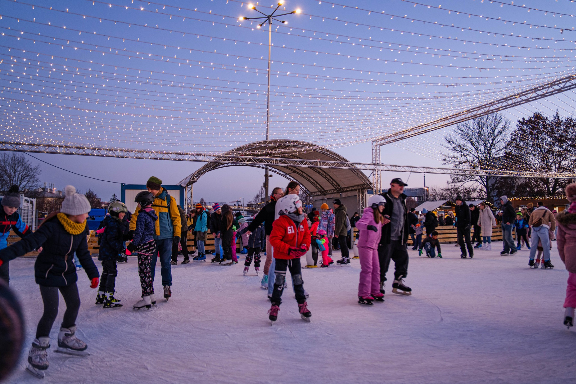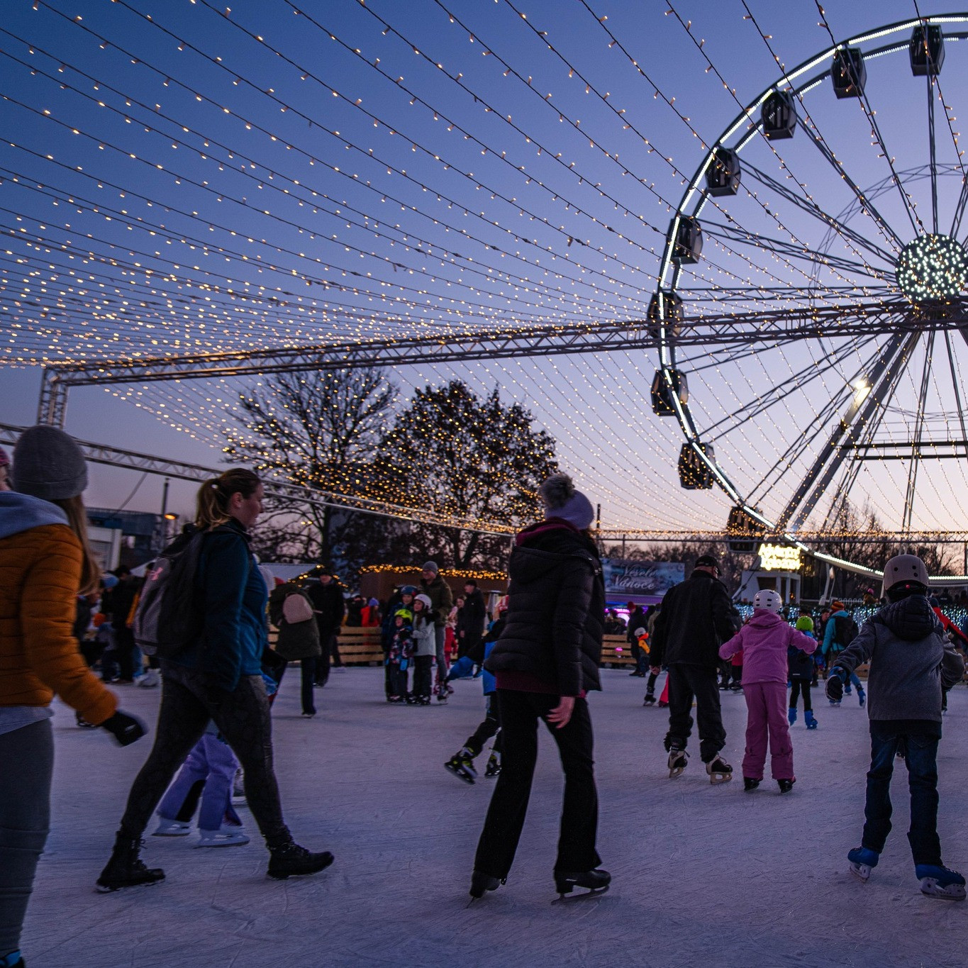 Kluziště pod širým nebem, lemované stánky s punčem, vůní dobrot a světelnou výzdobou, bude v provozu až do 4. ledna 2026. K dispozici je půjčovna bruslí, šatna i prostor pro přezouvání, takže si zimní radovánky mohou dopřát i ti, kteří brusle nevlastní.