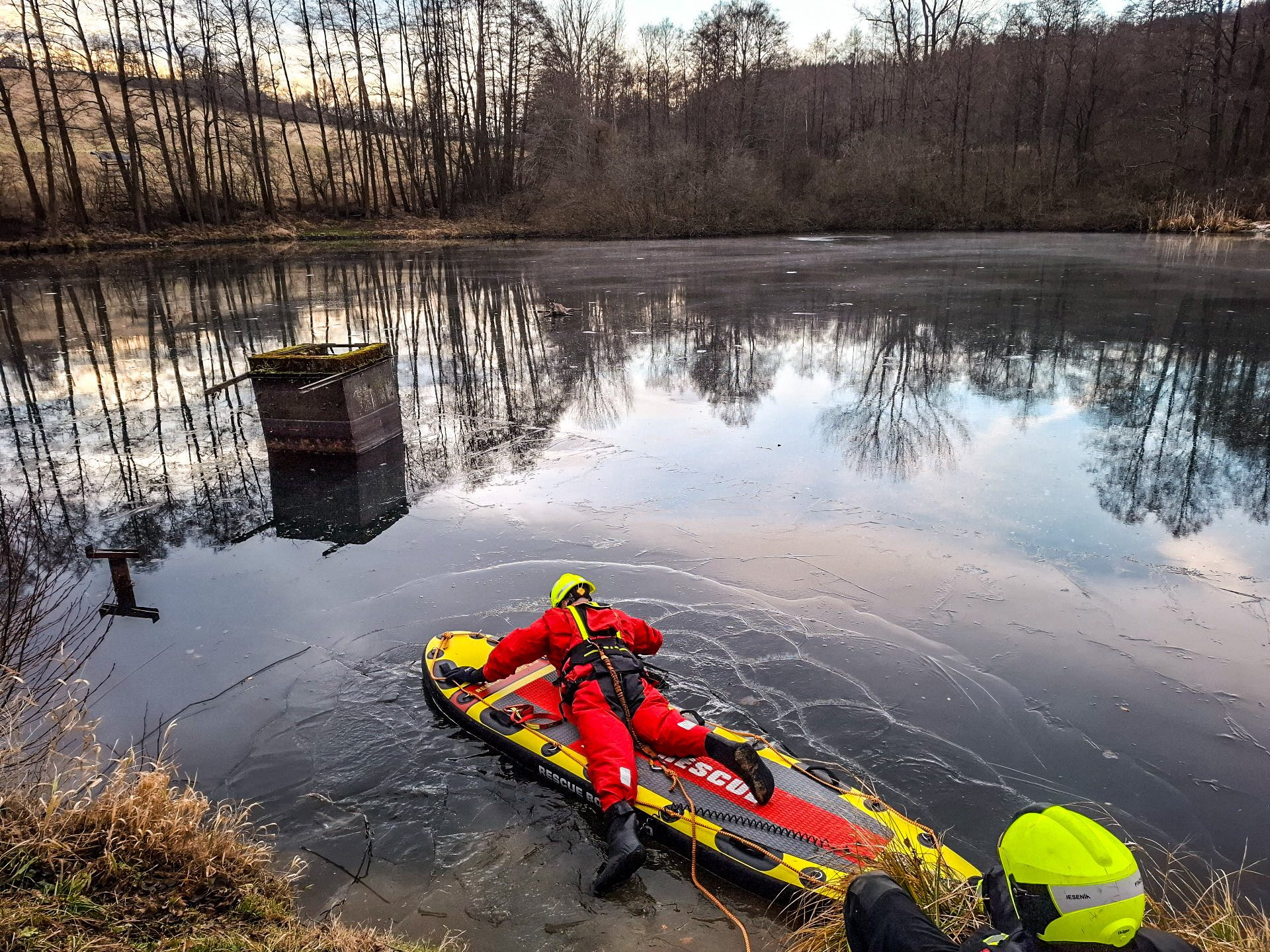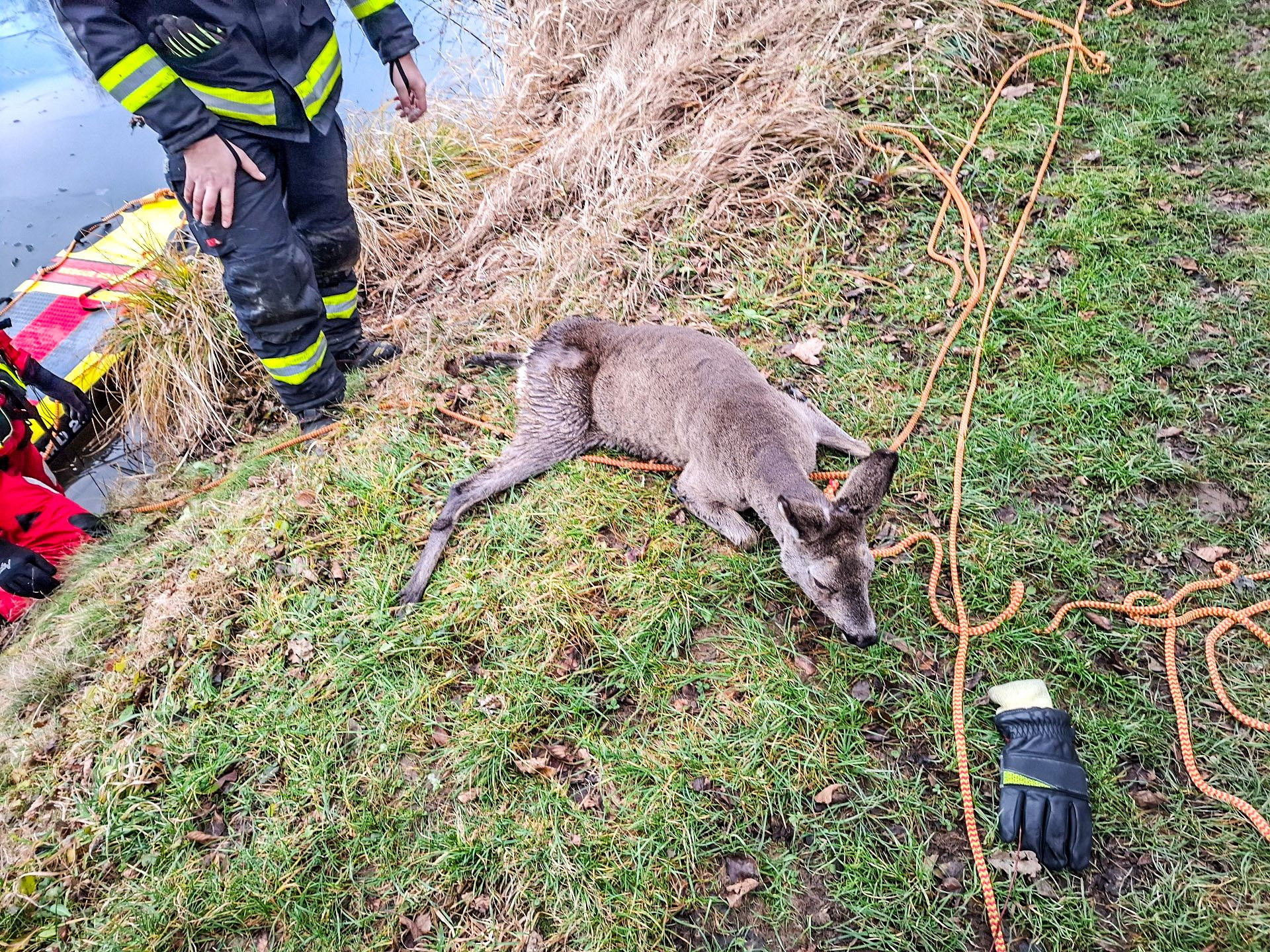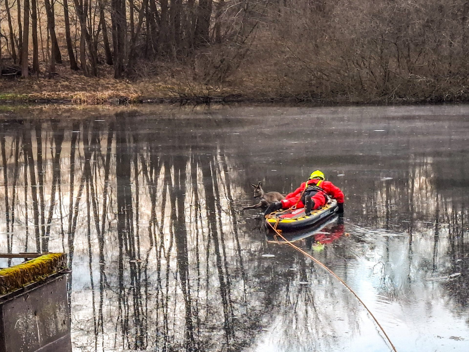 Kvůli riziku prolomení ledu hasiči k zásahu využili rescue paddleboard, který umožňuje lepší rozložení váhy zachránce a bezpečný pohyb po neúnosném ledě. Díky tomu se podařilo srnu dostat na okraj břehu bez zranění.