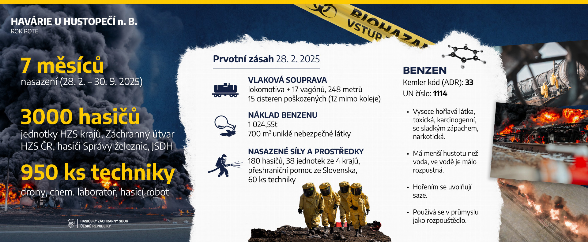 Po nehodě vlaku, který v 17 cisternách převážel téměř 1 025 tun toxického benzenu, se nebezpečná látka vznítila. Následoval požár mimořádného rozsahu. Jak dnes připomíná mluvčí hasičů Lucie Balážová: „Po železniční dopravní nehodě vlaku, který převážel v 17 cisternách téměř 1025 tun toxického benzenu, se nebezpečná látka vznítila a způsobila požár a rozsáhlou havárii, s jakou se žádný hasičský sbor ve světě pravděpodobně nesetkal. Na místě jsme zasahovali 7 měsíců. Stále spolupracujeme se subjekty, které nyní řeší sanaci území. V případě potřeby jsme připraveni zasáhnout.“